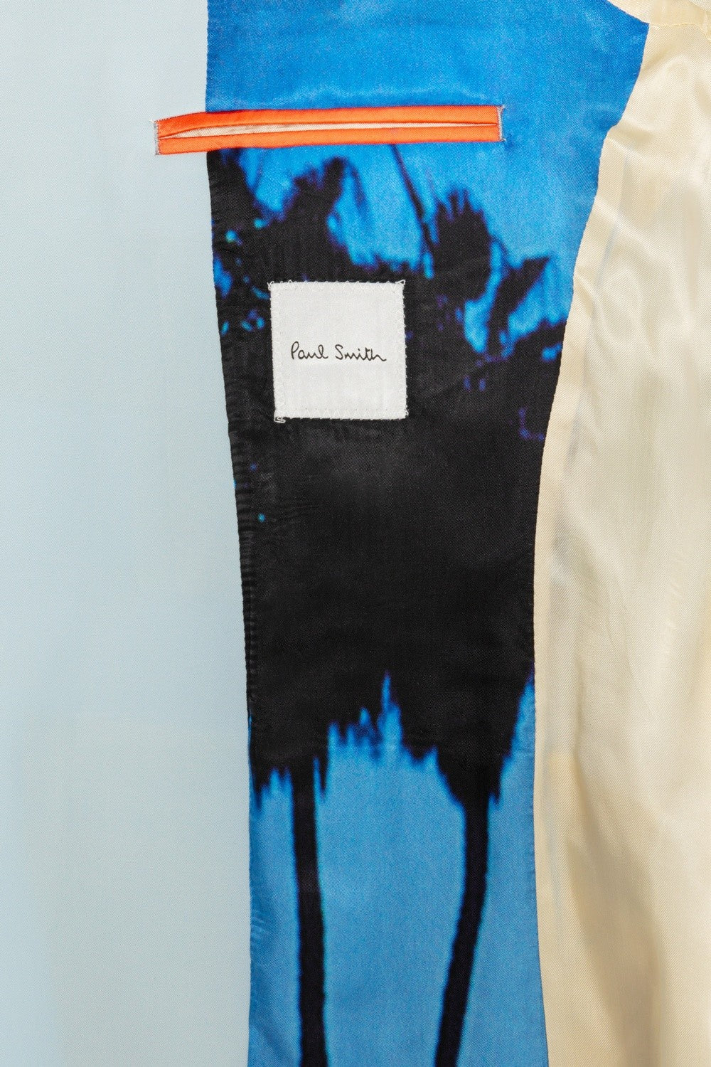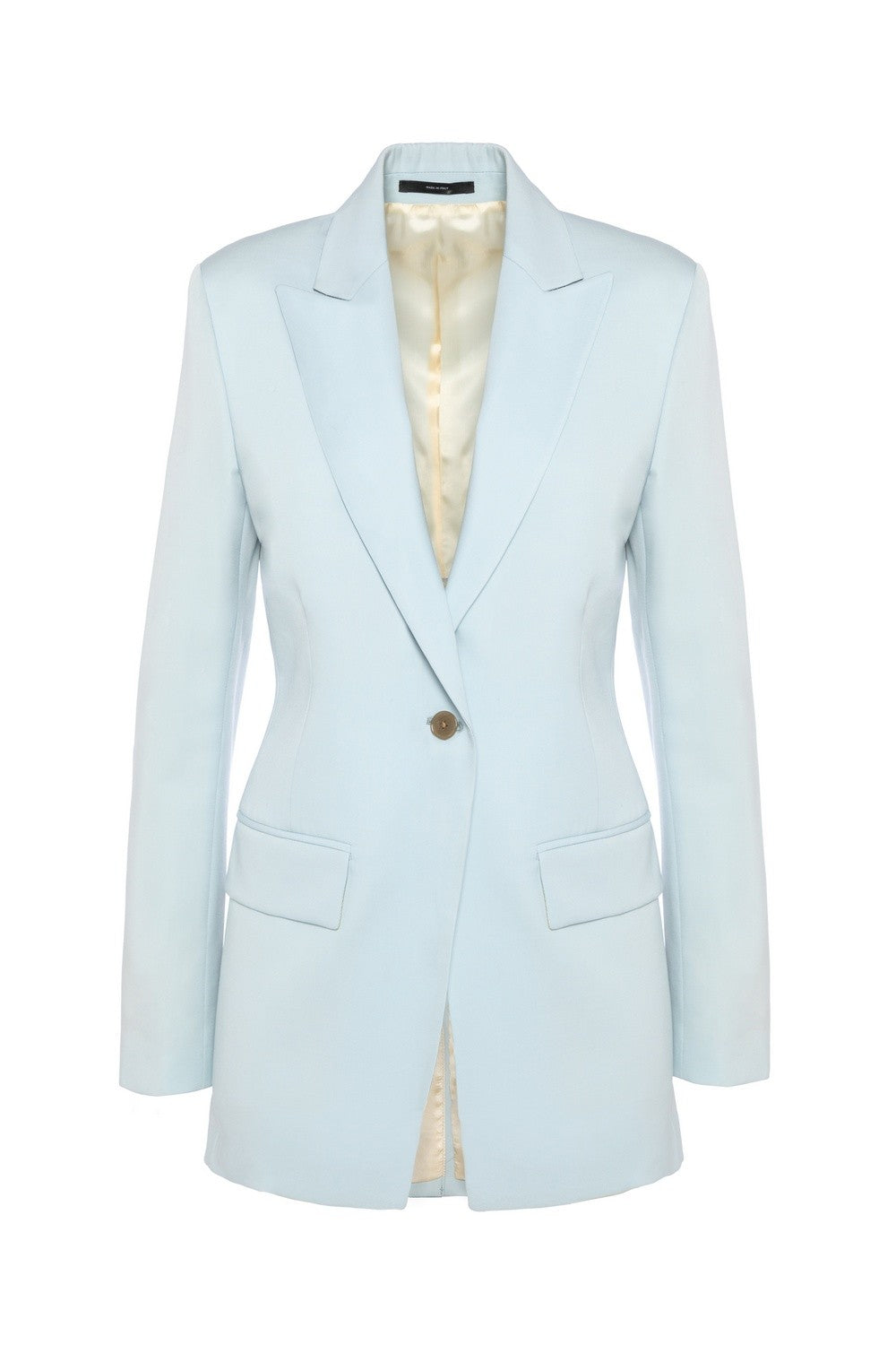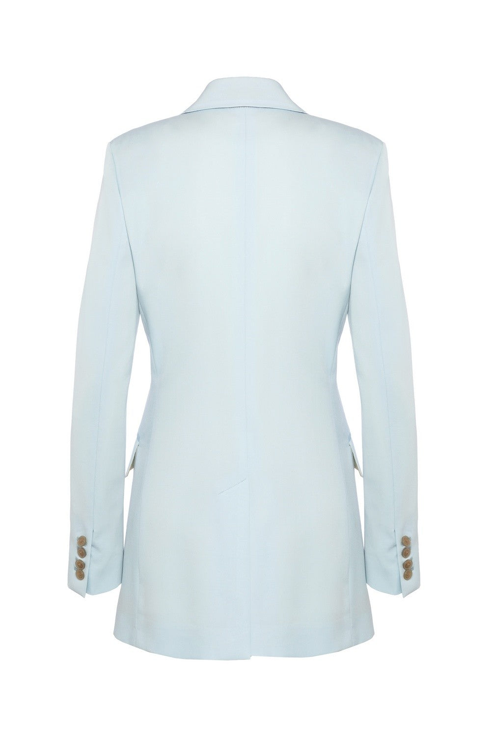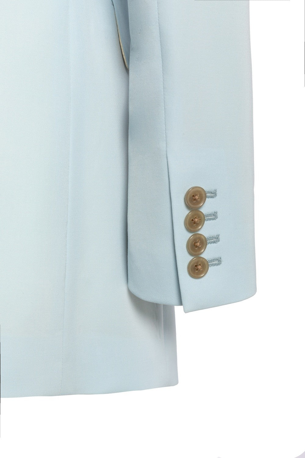 Bottoni in corno, spalline, polsini con bottoni, due tasche laterali con patta, chiusura con bottone sul davanti monopetto, totalmente foderato e con mono spacco sul retro.
