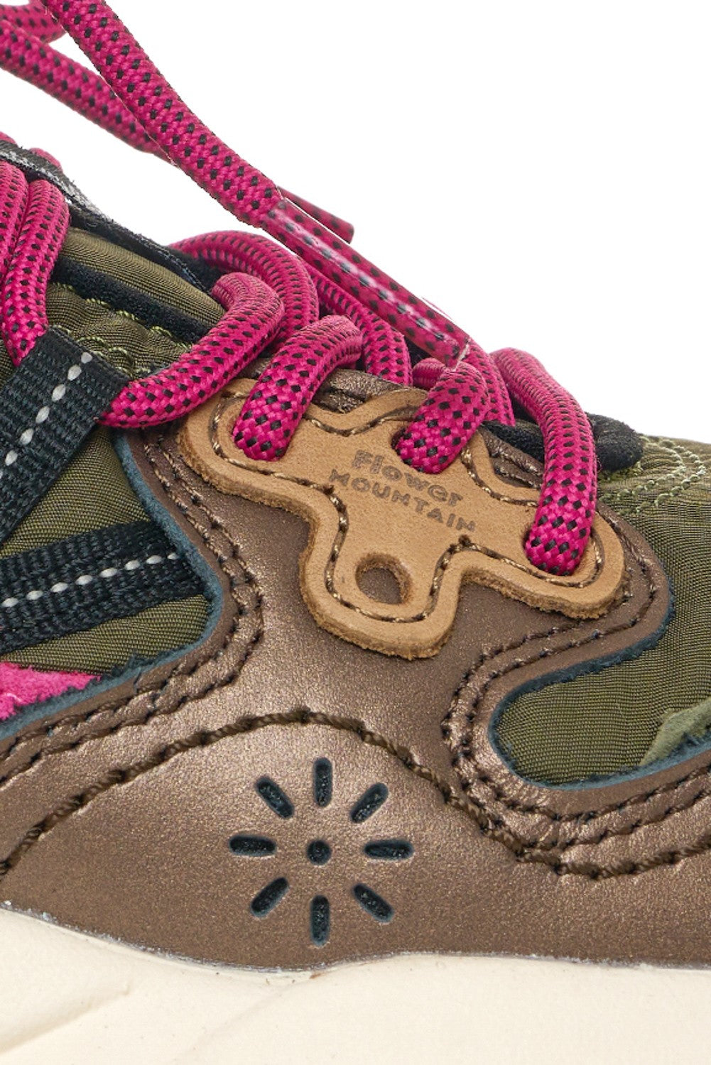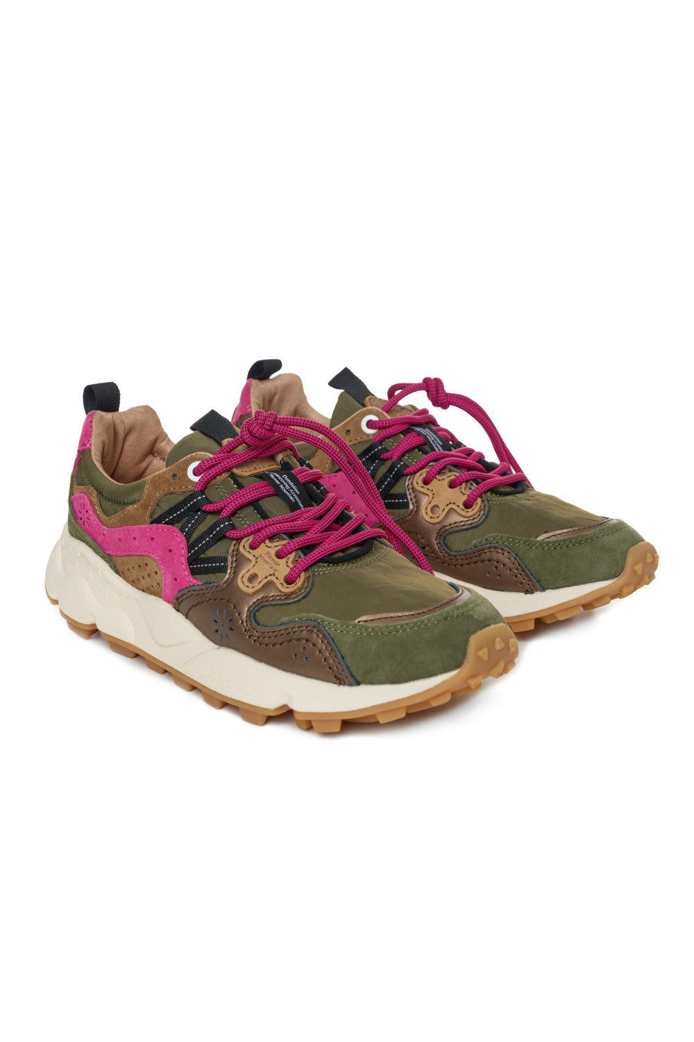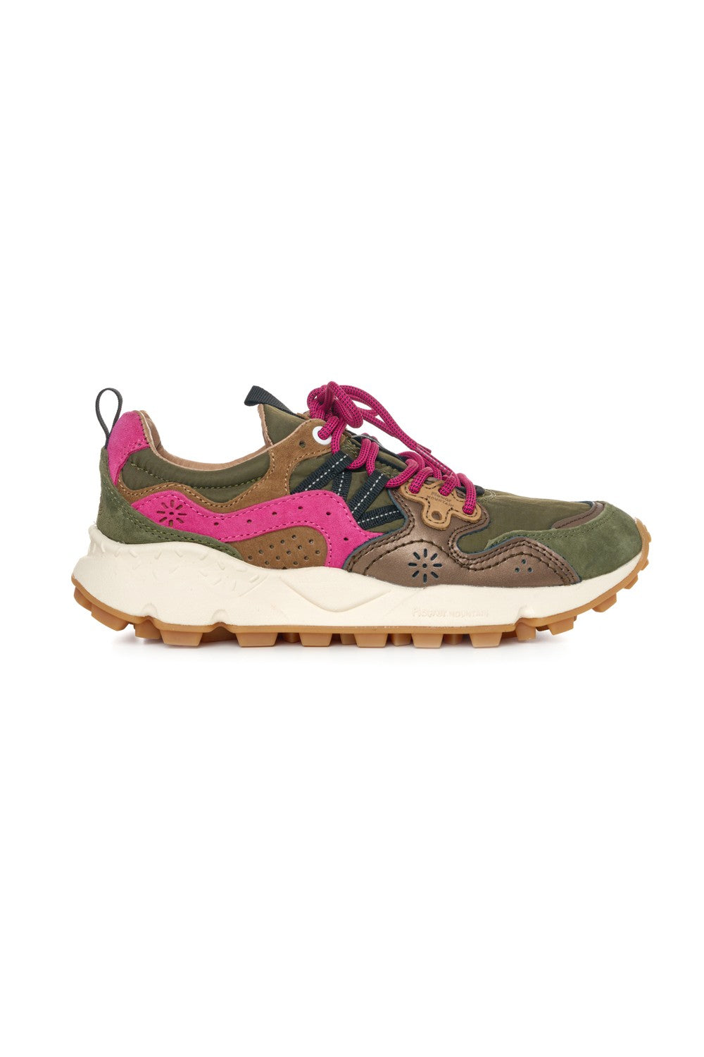 Nuova interpretazione della Yamano 3 Flower Mountain: Sneaker in tessuto tecnico con inserti in suede multicolor nelle nuance verde bosco e rosa intenso. L'allacciatura con occhielli rinforzati è un elemento distintivo del brand, come la soletta interna in sughero antibatterico e il fondo in gomma ultra leggera con battistrada dentellato.