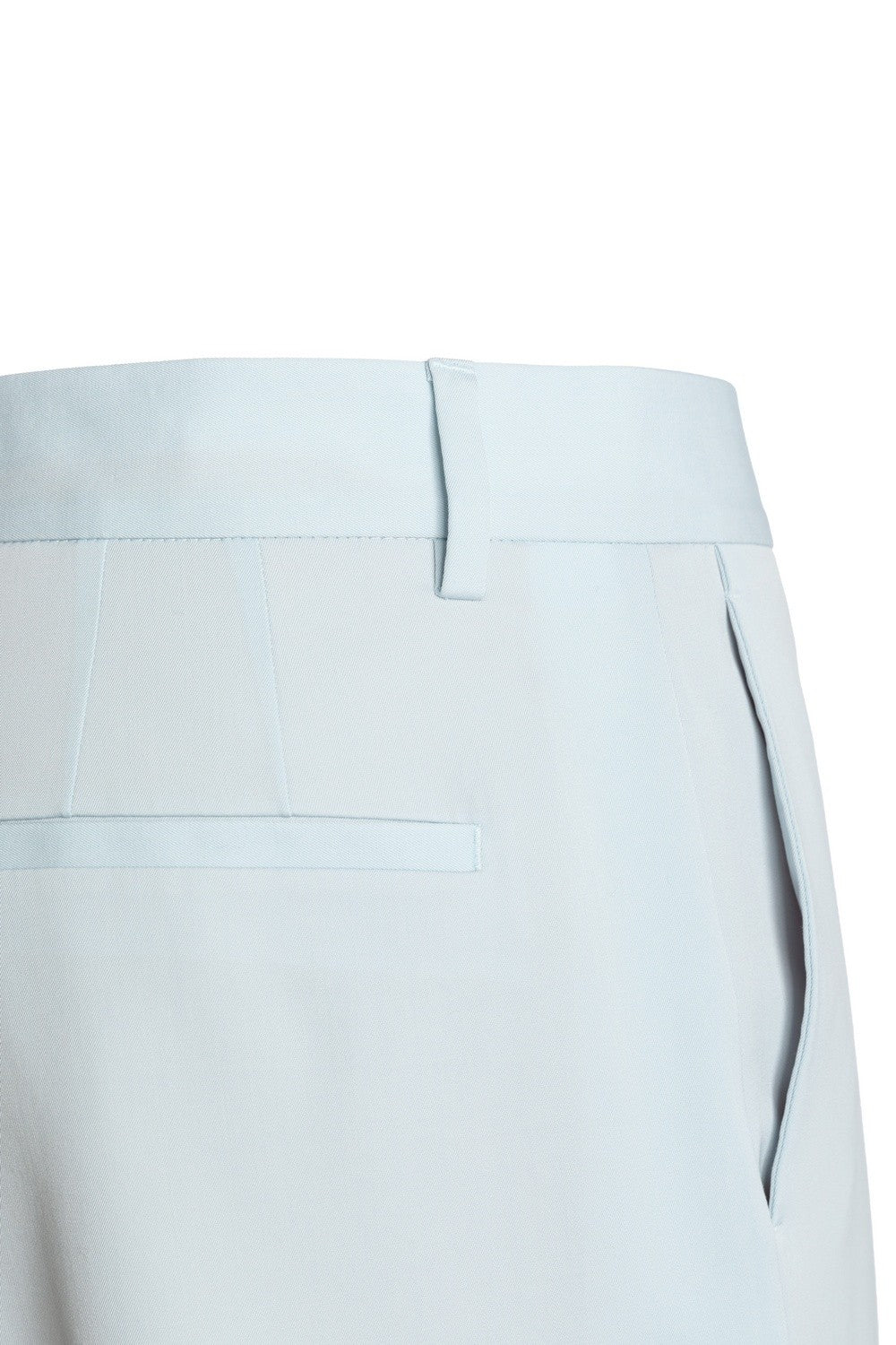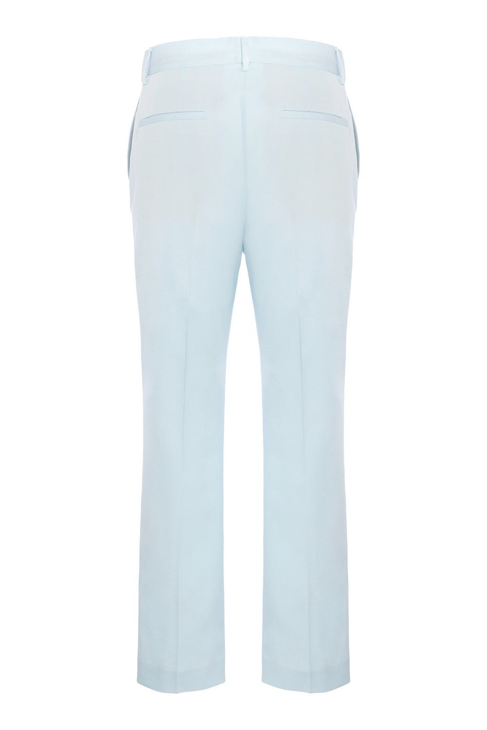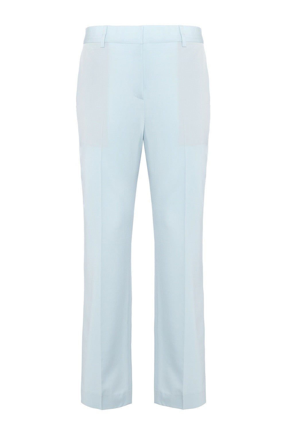 Pantaloni a gamba dritta in twill di lana, bottoni in corno, pieghe pressate, due tasche posteriori a filetto, due tasche oblique laterali, passanti per cintura, taglio a vita media, chiusura frontale con gancio e bottone e zip nascosti.