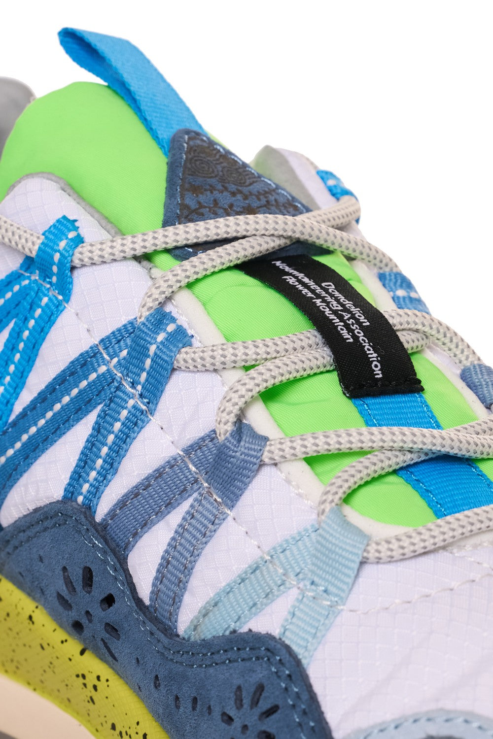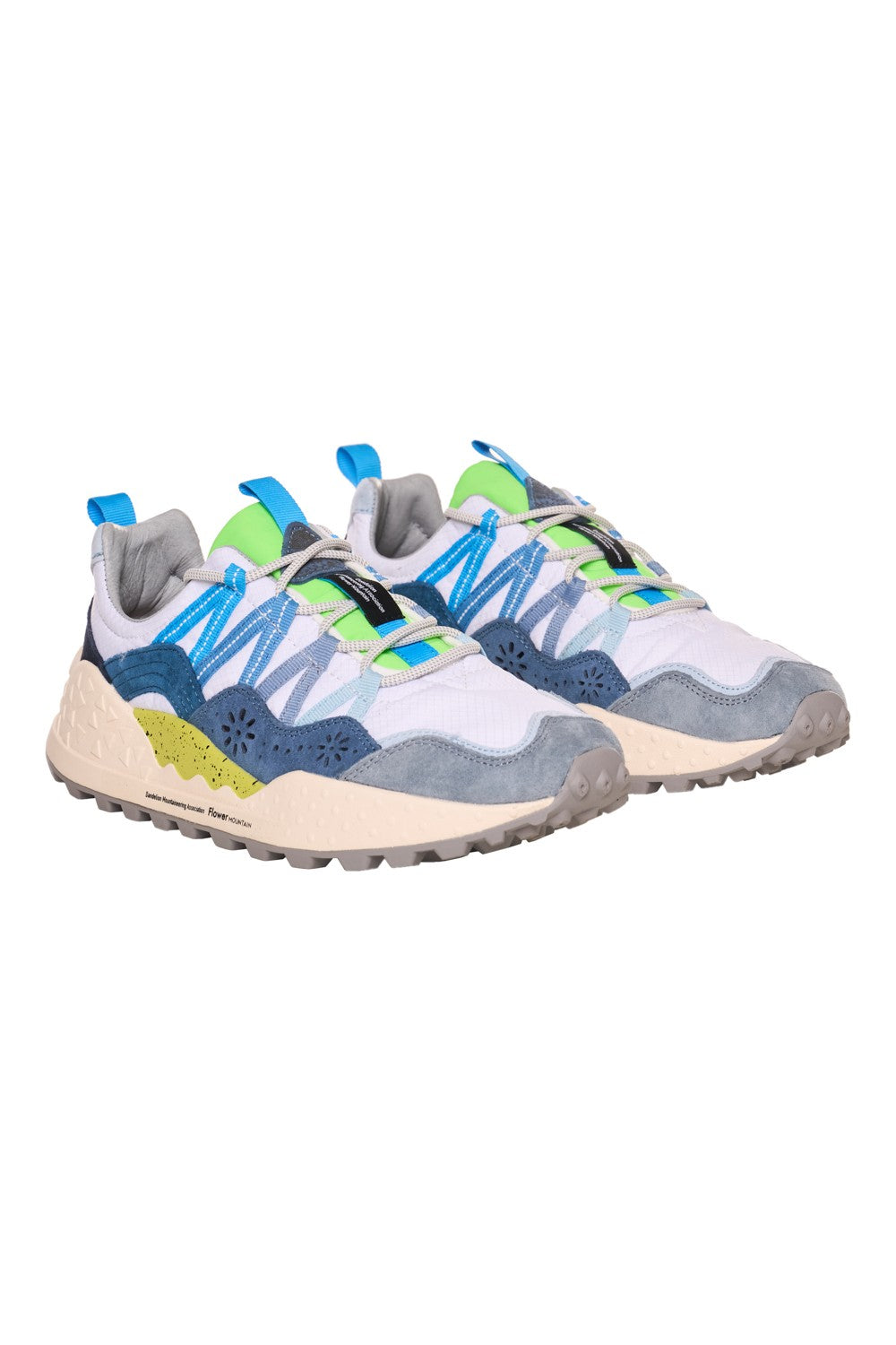 Sneakers in stile running. La tomaia è realizzata in un mix di materiali tra cui tessuto tecnico, pelle e camoscio, il colore bianco predomina con dettagli di colore celeste, blu, azzurro, verde fluo, lime e grigio. I lacci sono tubolari in cotone bianco caratterizzati da occhielli rinforzati caratteristici del brand. Internamente è foderata in pelle e tessuto tecnico traspirante, mentre la morbida soletta ergonomica ed estraibile è in sughero antibatterico. La suola in gomma ultra leggera color crema presenta in rilievo delle forme geometriche e una base dentellata di colore grigio. Altezza tallone dal suolo: 4 cm.